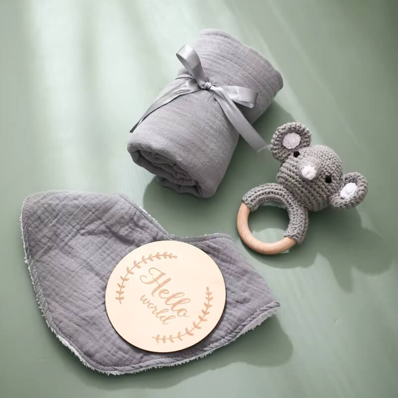 A perfect gift set to spoil a newborn baby! Beautifully presented, featuring warm tones and textures, the Mist baby gift box is sure to delight and be a unique gift for a newborn or a baby shower.