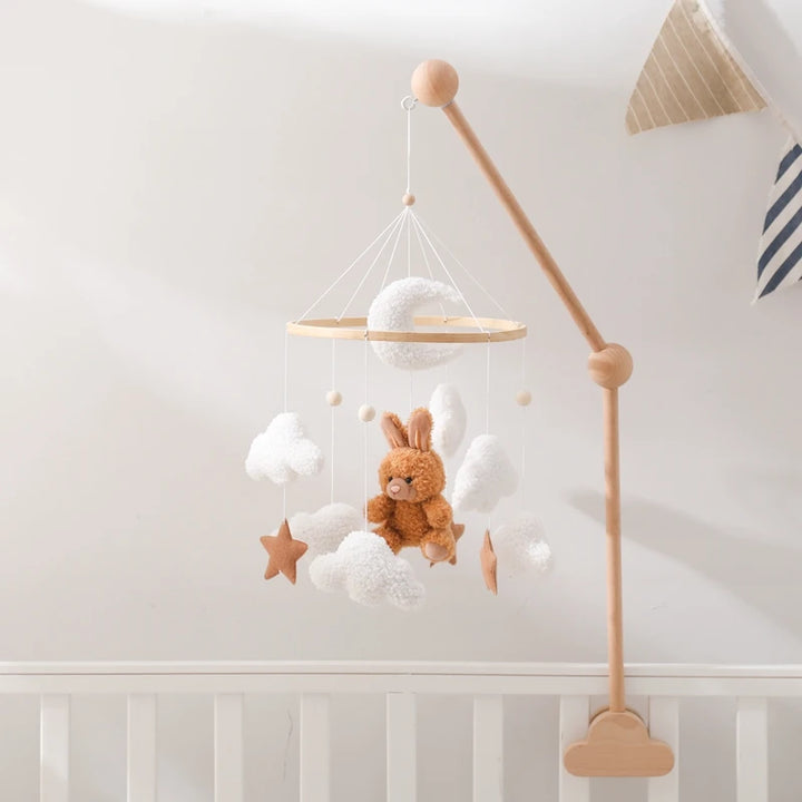• Cot mobile featuring bunny, clouds, and stars made from felt.
